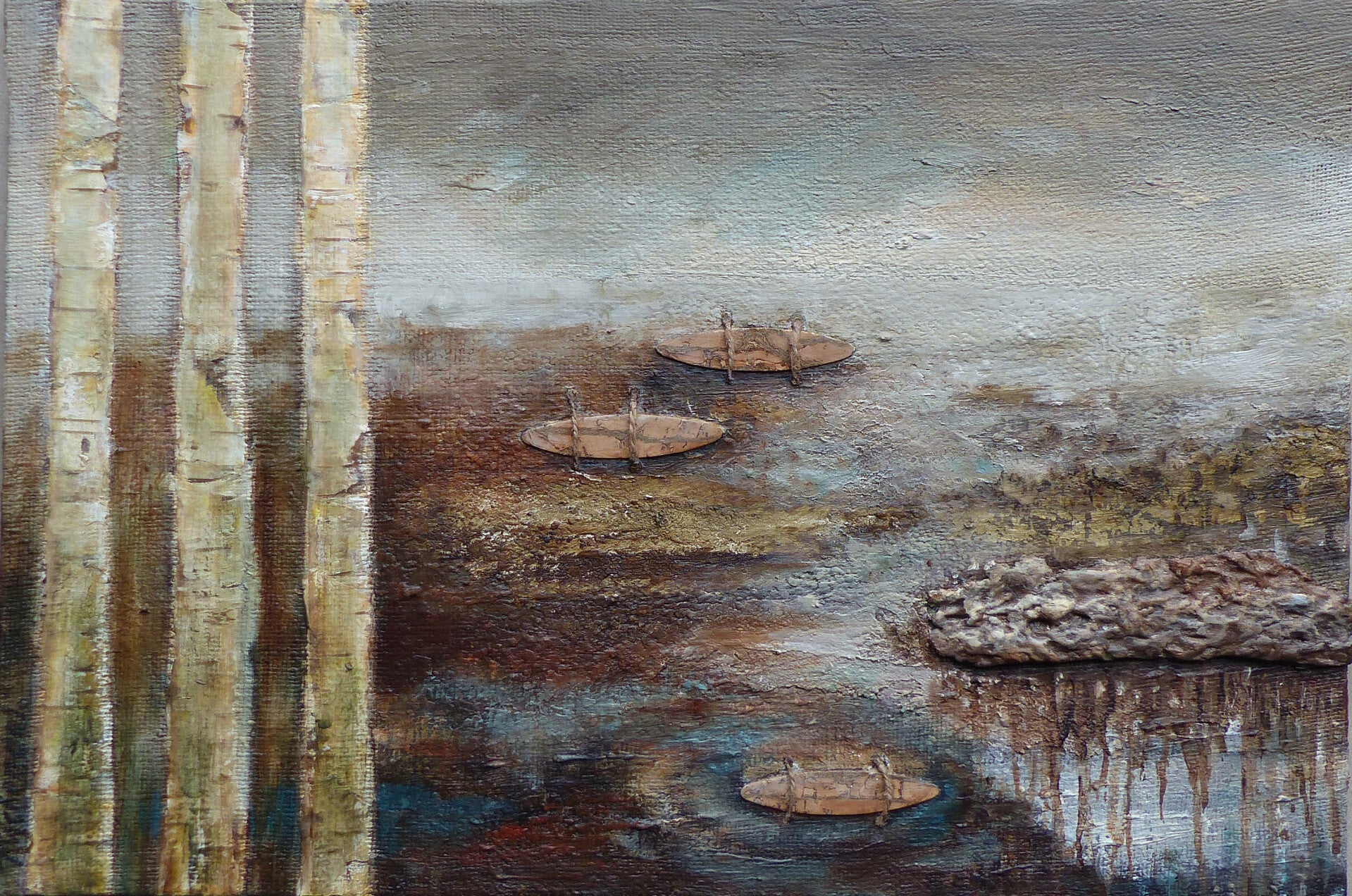 Miniatuur schilderijtjes acryl/ aquarel met berkenschors.